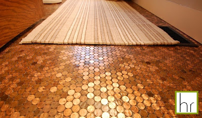 Instead of tile, Joe is going the "penny" route. He's working on his downstairs bathroom.